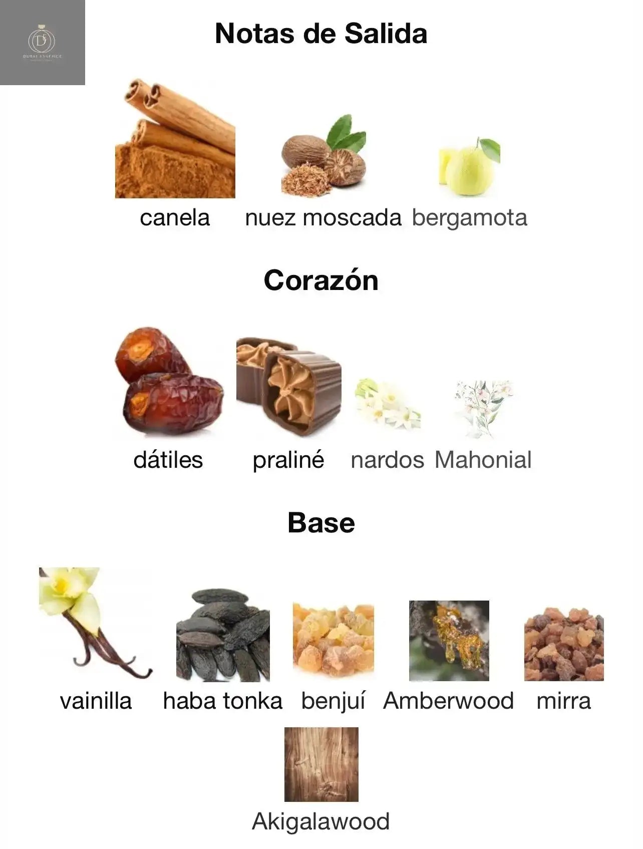 Starting with a subtle and delicate bergamot, which opens perfectly in the top note to give way to good liquor, a balanced sweetness combined with an alcoholic note and creamy cinnamon that gives a feeling of immense luxury.The great complement to this fragrance is the combination of dates and praline, creating the atmosphere of a delicious gourmand wrapped in 24-karat gold.